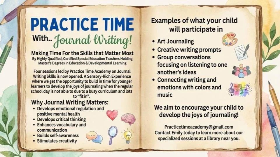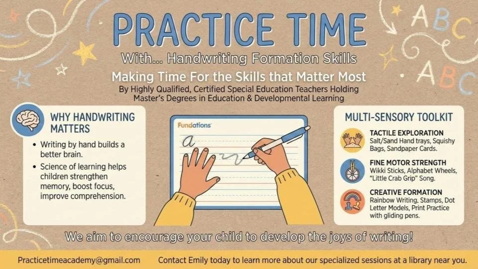Through her work in the classroom , she recognized that many children simply needed more time to practice foundational skills in a supportive, low pressure environment. Practice Time Academy was created to provide that space- where children can strengthen skills through engaging, hands on activities designed to build confidence and independence.